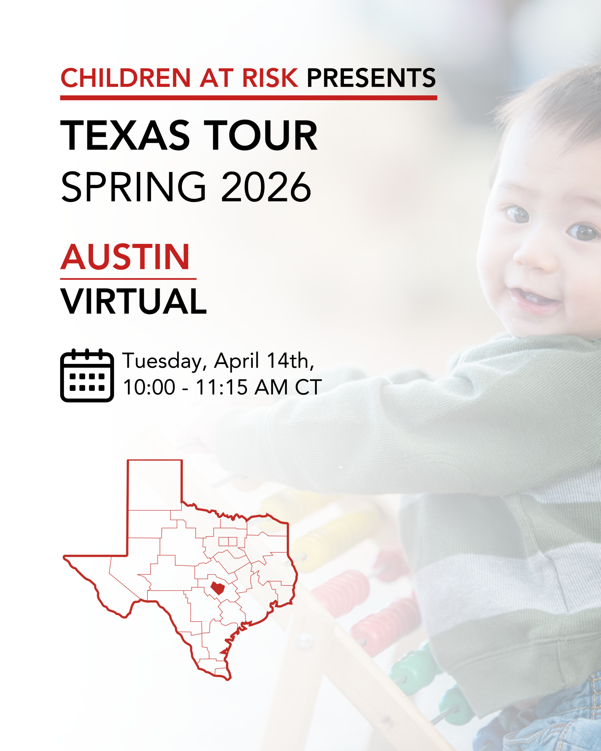 Join CHILDREN AT RISK’S Early Education team on Tuesday, April 14, 2026 from 10 AM- 11:15 PM (CST) to provide local insight from Austin and help shape the future of children in Texas.