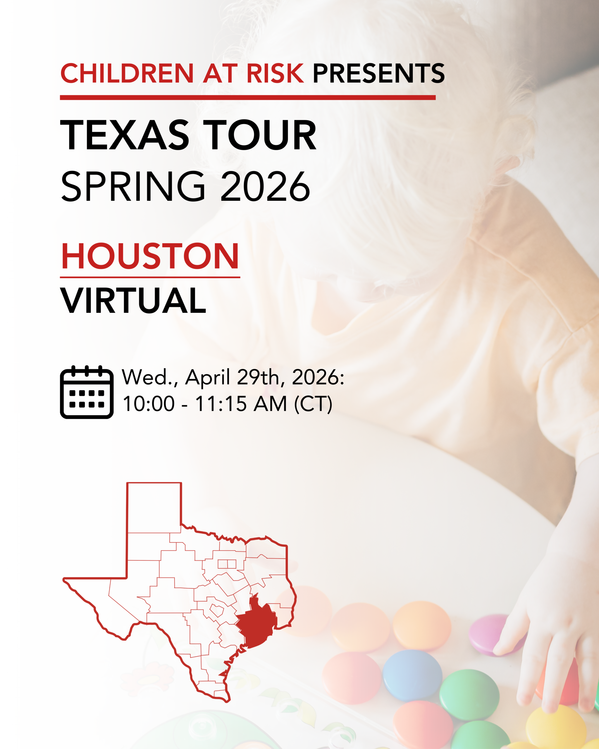 Join CHILDREN AT RISK’S Early Education team on Wednesday, April 29, 2026 from 10 – 11:15 AM (CST) to provide local insight from Houston and help shape the future of children in Texas.