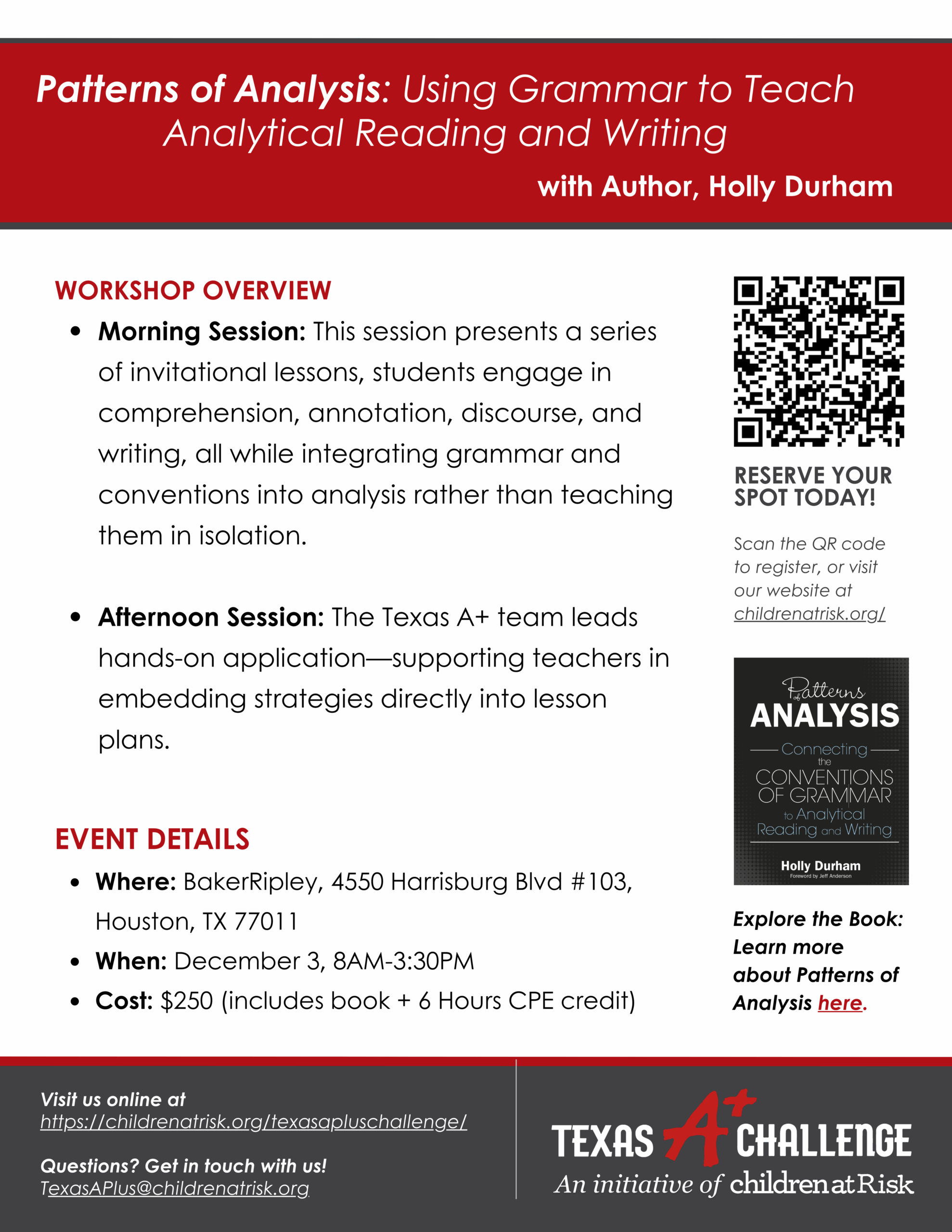Registrants earn 6 hours of CPE credits and receive a copy of Patterns of Analysis, a book designed to support educators grades 6-12.